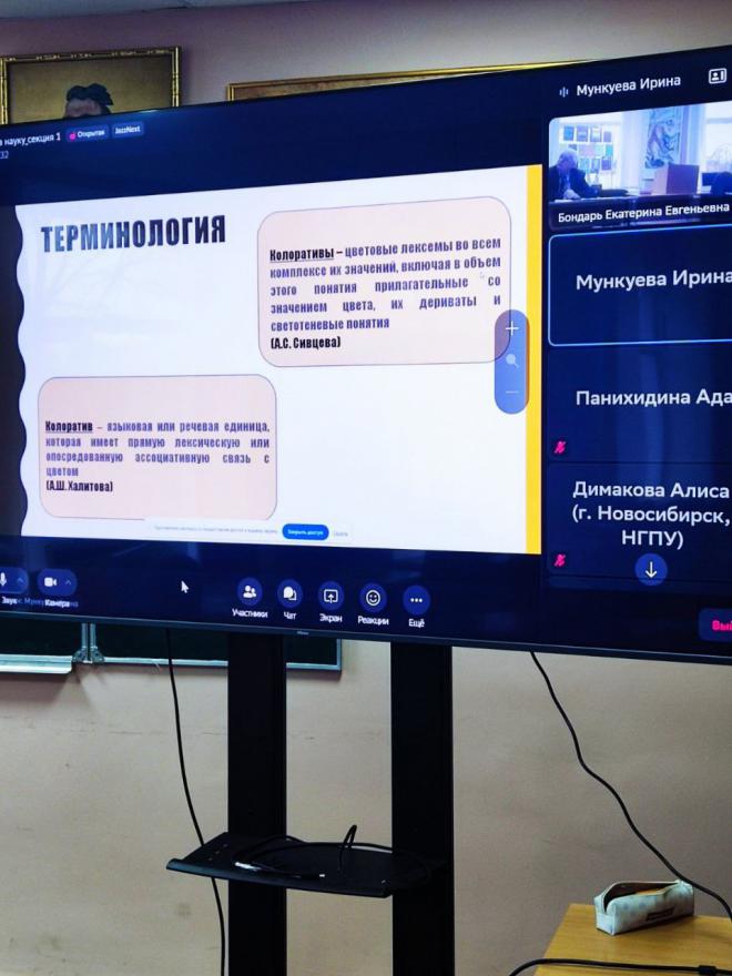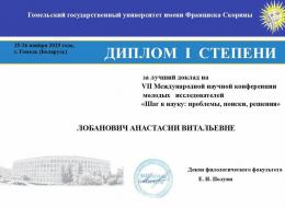 На пленарном заседании достойно представили научные работы молодые исследователи из Новосибирска, Магнитогорска, Санкт-Петербурга, Ростова-на-Дону и Гомеля. Тематика докладов максимально широка и всеобъемлюща: методика преподавания РКИ, фразеология, мифология, паремиология, литературоведение. Так, выступление Екатерины Грищенко (г. Новосибирск) было посвящено лингводидактической игре как инструменту раскрытия страноведческого потенциала паремий на уроке РКИ. Дарья Коровинская (г. Магнитогорск) познакомила слушателей с особенностями психологизма в драме М. Ю. Лермонтова «Маскарад», акцентировала внимание на функции маски. Виктория Кравченко (г. Гомель, студентка гр. РФ-31 ГГУ имени Ф. Скорины) проанализировала происхождение и особенности функционирования фразеологизма «хромая утка». Анастасия Лобанович (г. Гомель, ГГУ имени Ф. Скорины, ассистент кафедры русского, общего и славянского языкознания, аспирант) обратила внимание участников на мифонимы и мифопоэтические образы в эмпоронимическом пространстве Гомеля. Екатерина Славгородская (г. Санкт-Петербург) представила результат работы над сербскими паремиологическими единицами с анималистическим компонентом и их вариантами. Милана Слащева (г. Ростов-на-Дону) описала роль речевой характеристики в создании образа главного героя рассказа А. Грина «Капитан Дюк». Все доклады были сопровождены яркими презентациями, вызвали живой интерес у аудитории.